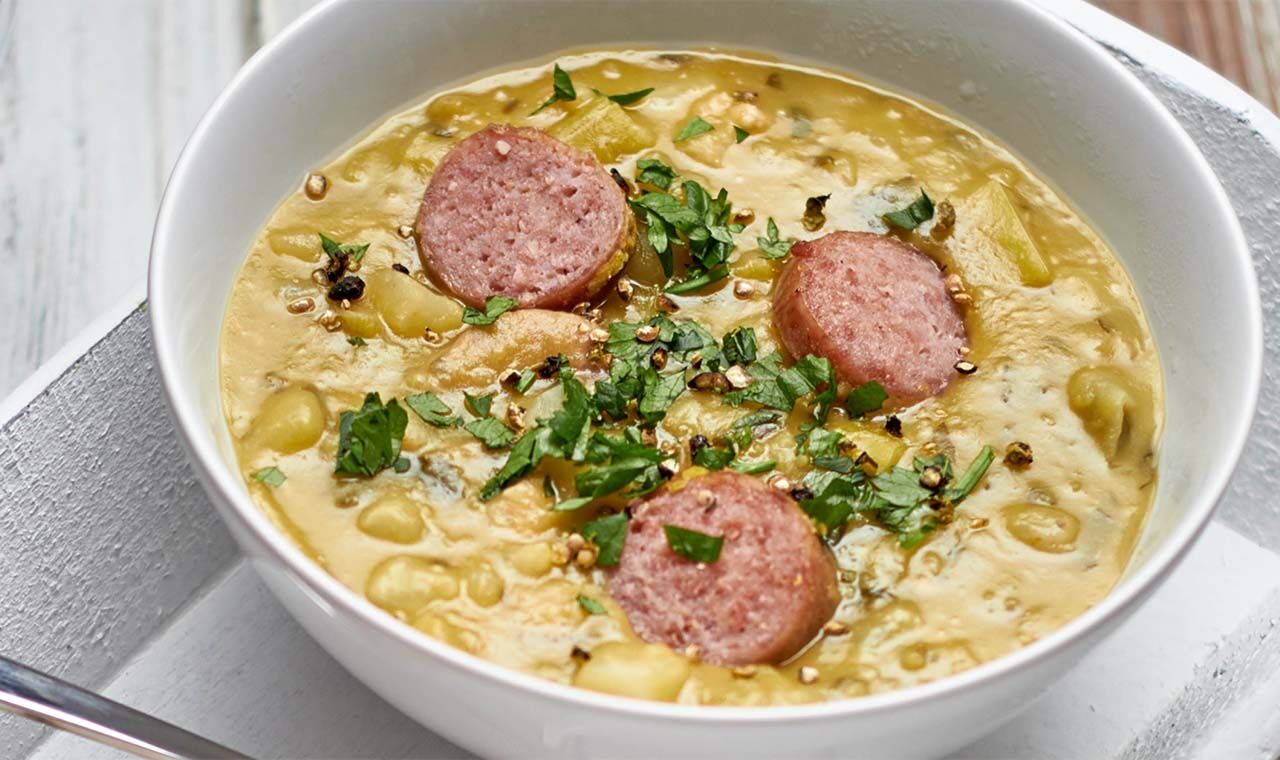 - Verwarm de erwtensoep (pas op dat de soep niet aankoekt op de bodem).
