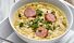 - Verwarm de rookworst in een pan water en snij hem in plakjes.