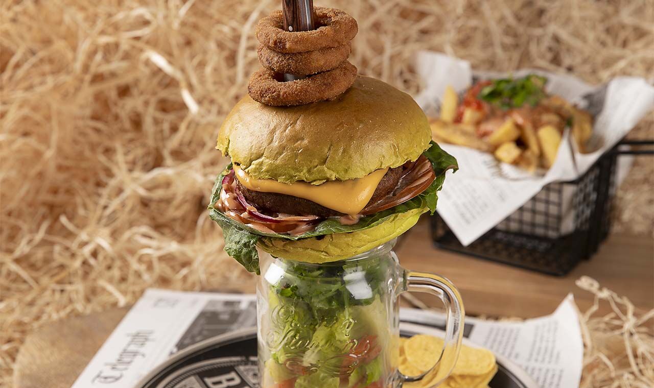 American veggie cheeseburger met krokante uienringen