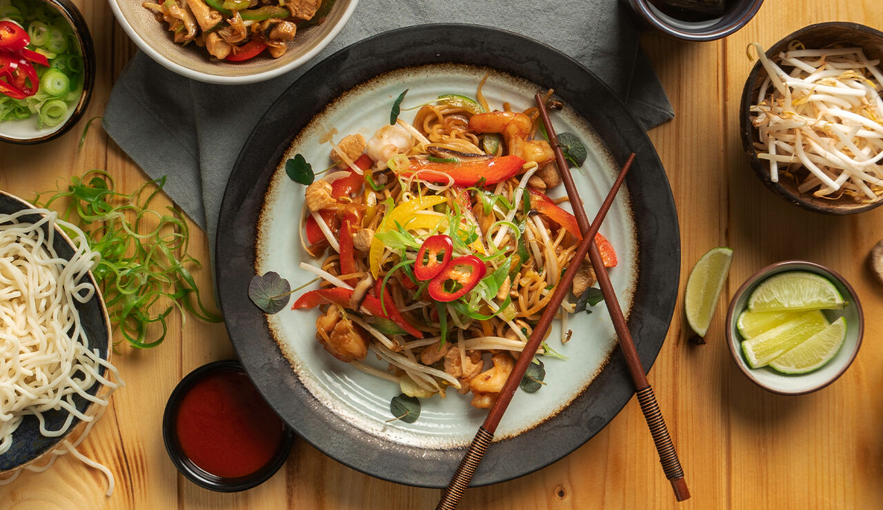Asian chicken noodle met kippendij, garnalen en shiitake