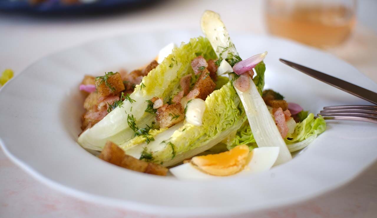 Asperge salade met little gem en peterselie, citroen en eetbare viooltjes