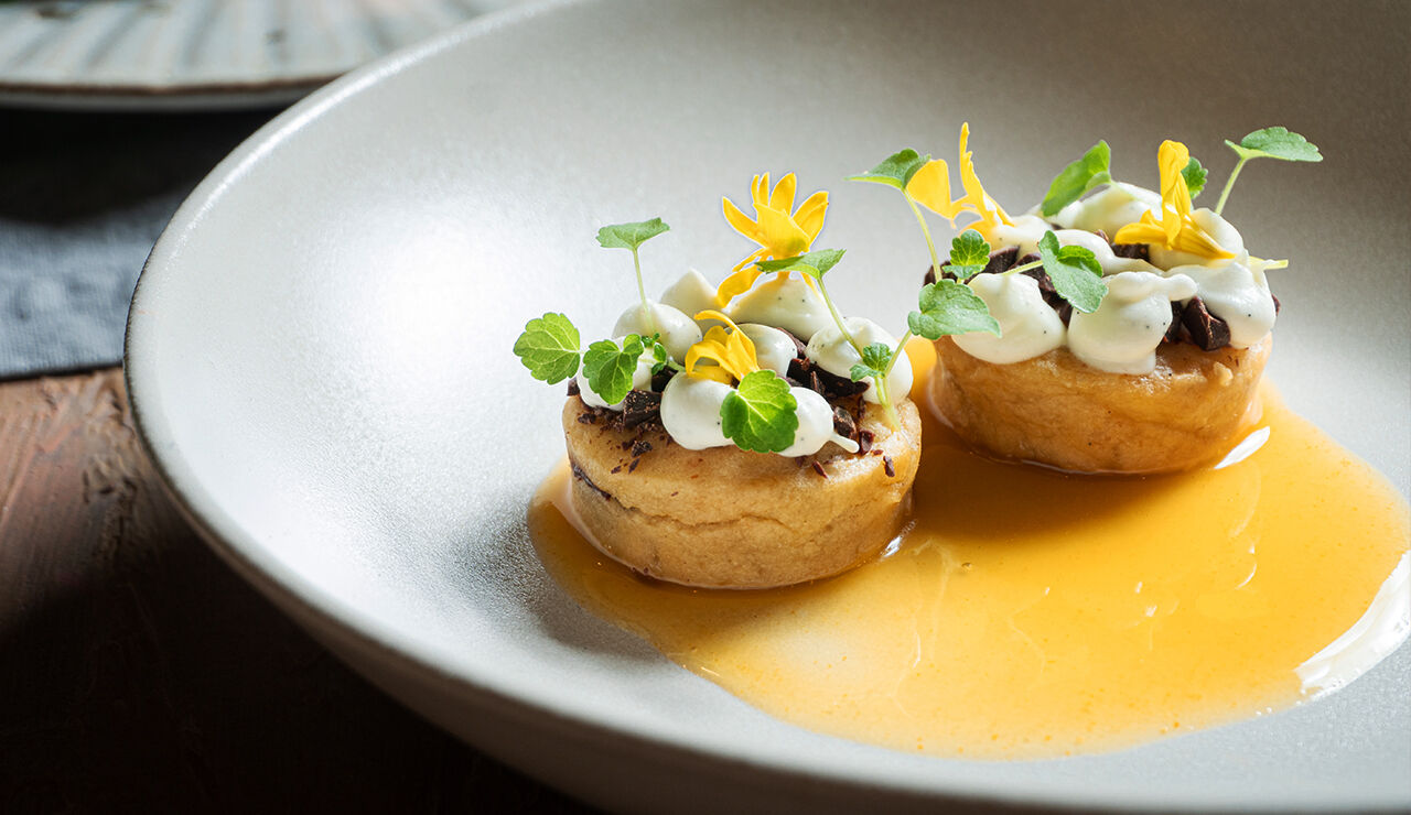 - Maak een grote druppel met twee eetlepels van de bruine rum siroop op het bord. Leg twee van de gedoopte baba's in de siroop. Hak de resterende chocolade callets en garneer de baba. Spuit hier chantilly dotjes bij en maak het gerechtje af met 2 takjes atsina cress.