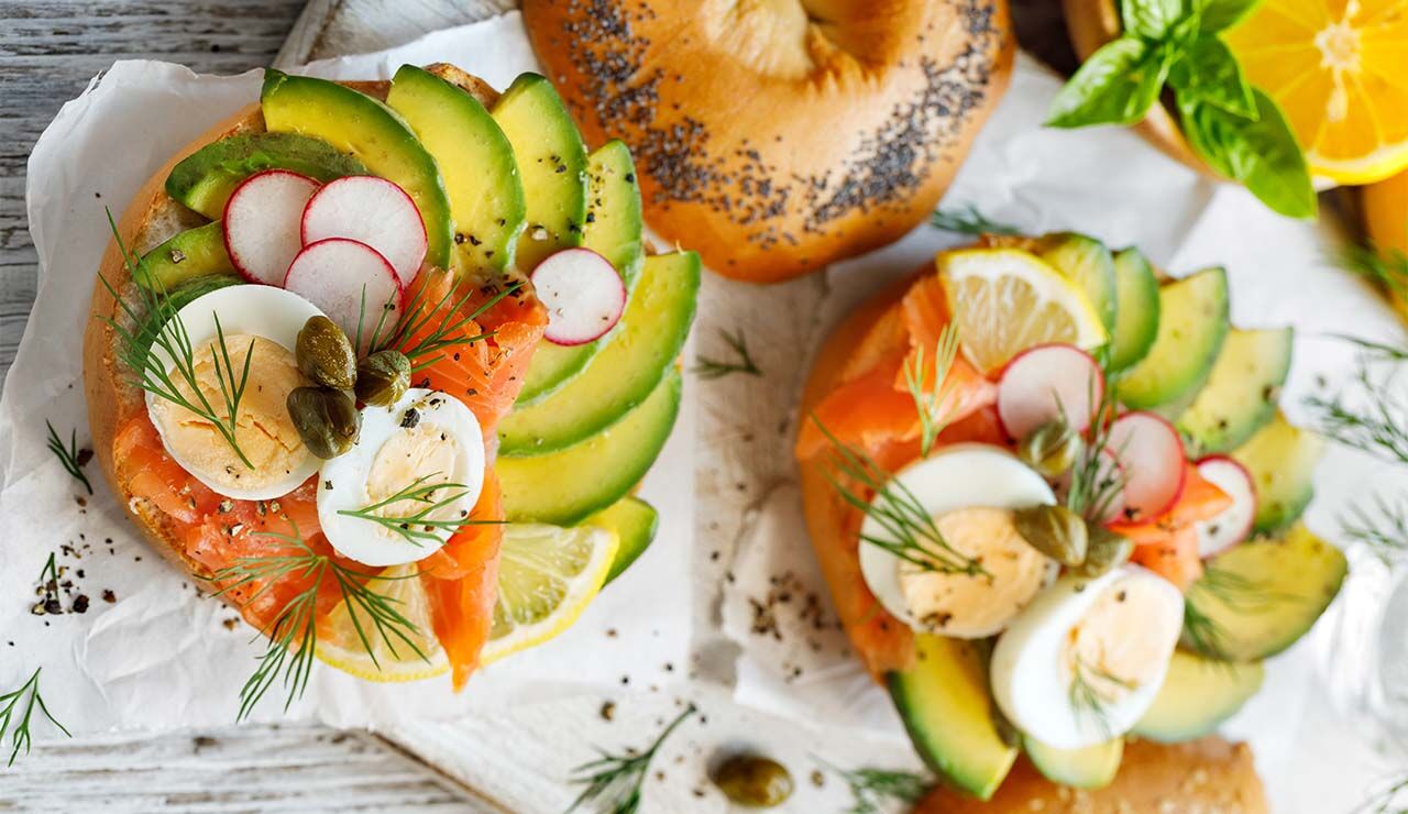 - Smeer op de onderkant van de bagel de roomkaas en leg dan de plakjes avocado als een waaier op de roomkaas, leg daarop de gerookte zalm.