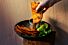 - Neem dan de peper uit de pan en doe ze in een kom met ongeveer 200 ml van de jus. Pureer de pepers tot een gladde moes met de staafmixer. Schep het mengsel dan terug in de pan met de jus.