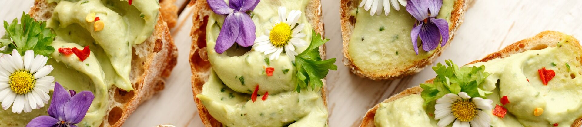 Canapés met avocadomousse en chili vlokken en eetbare bloemen