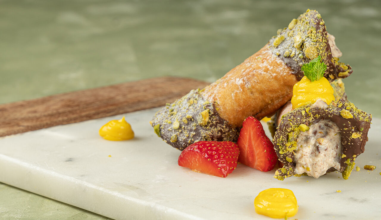 Cannoli gevuld met amandel crème en een cremeux van mango