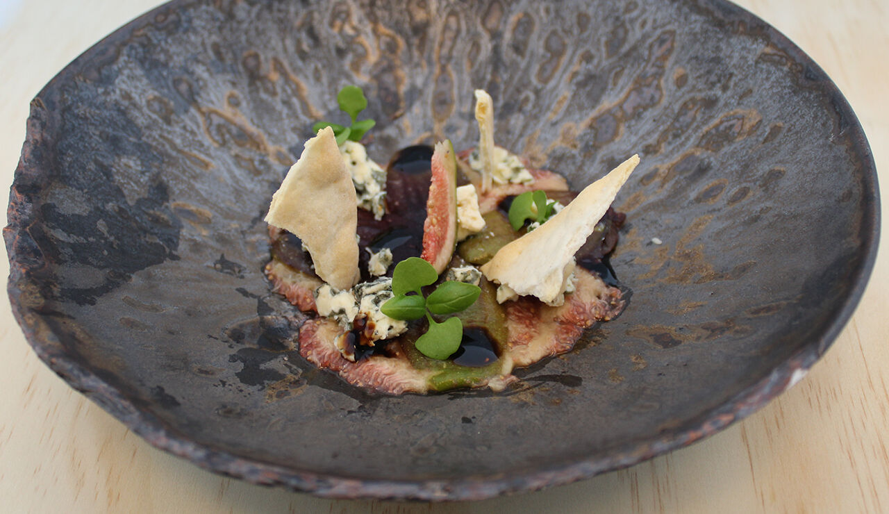 - drappeer speels ongeveer vijf druppels van de balsamico op de vijg en 3 takjes basilicumcress.