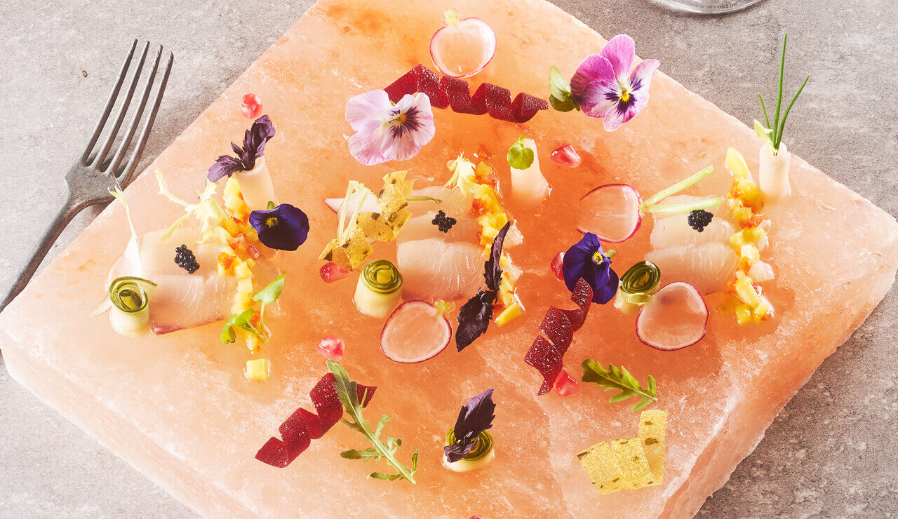 Ceviche van kingfish met zoet zuur, komkommer rolletjes en radijs