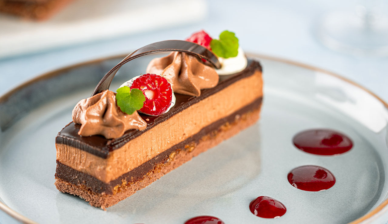 Choco mousse ganache met monchou, melkchocolademousse en frambozen