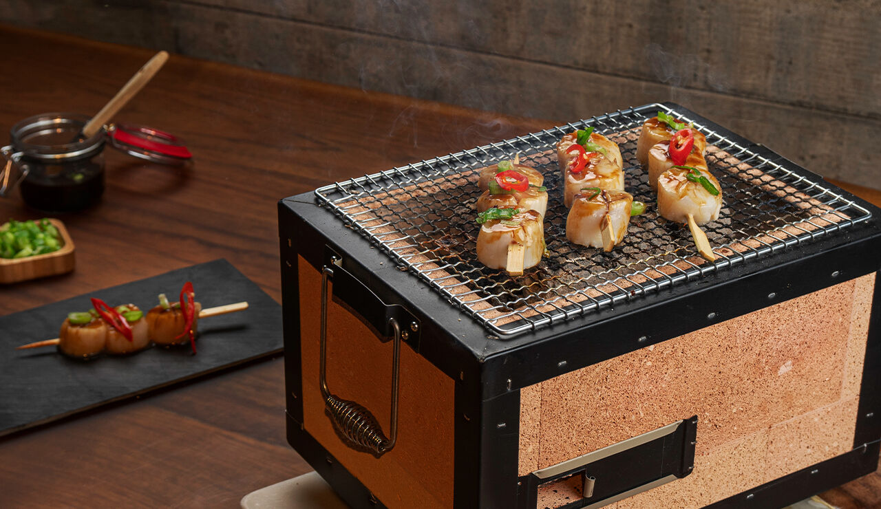 Coquilles van de grill met teriyaki mirinsaus, rode peper en bosui