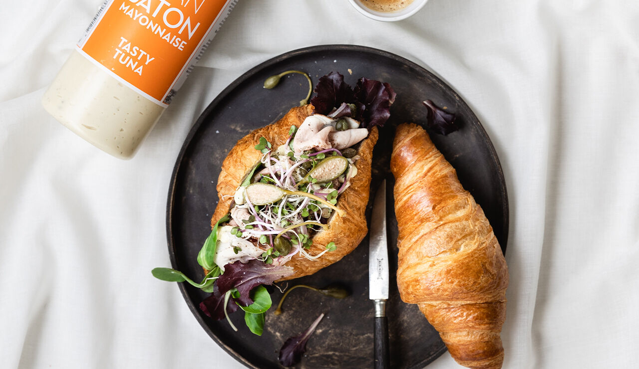 - Snijd de warme croissants in aan de bovenzijde en smeer wat Jean Bâton Tasty Tuna mayonaise aan de binnenzijde.