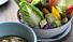 - Snijd de komkommer en de paprika in batonets. Snij de radijs in plakjes.