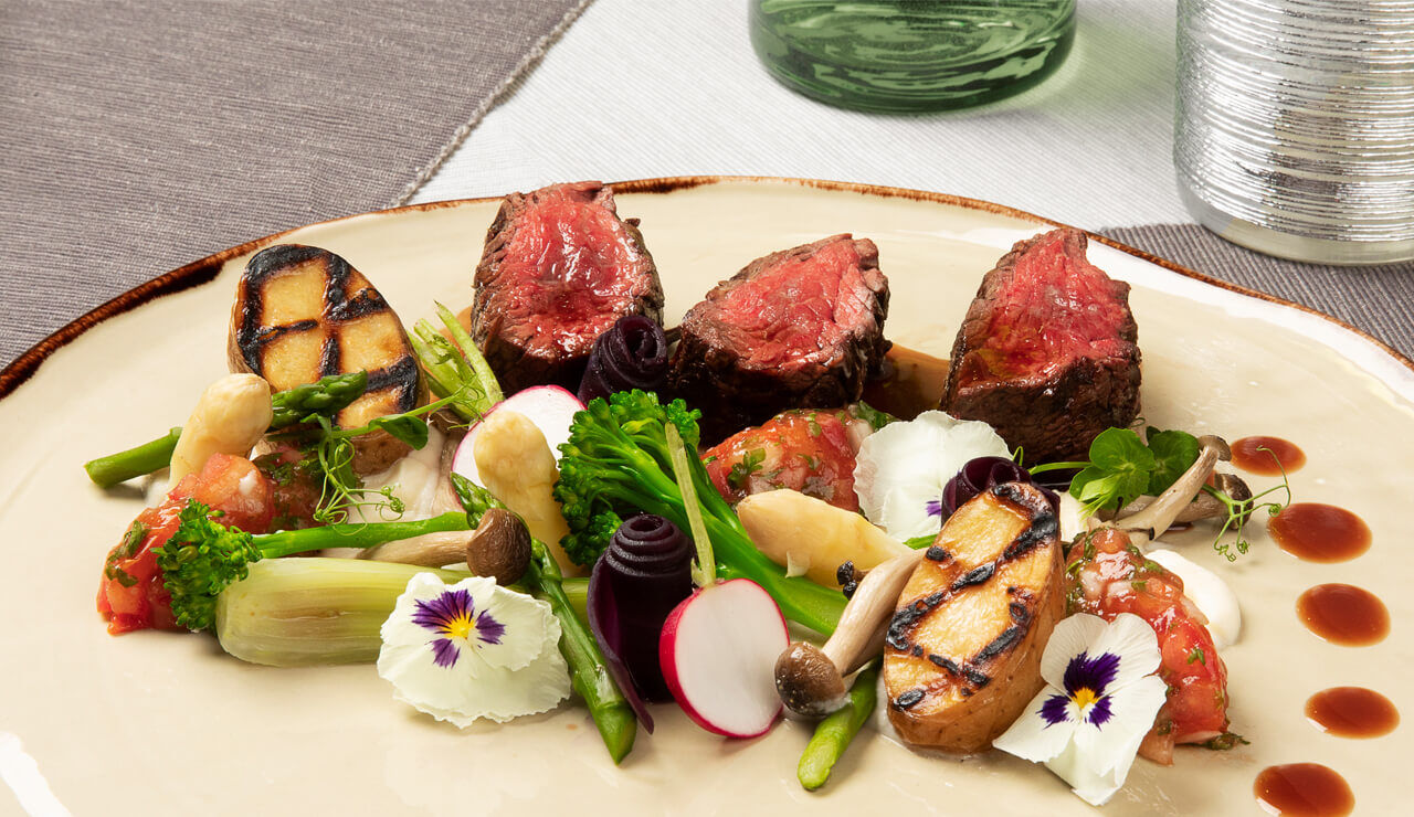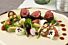 - Nappeer de wijnsaus op het bord en garneer het gerecht met drie eetbare bloemen en de plukjes cress.