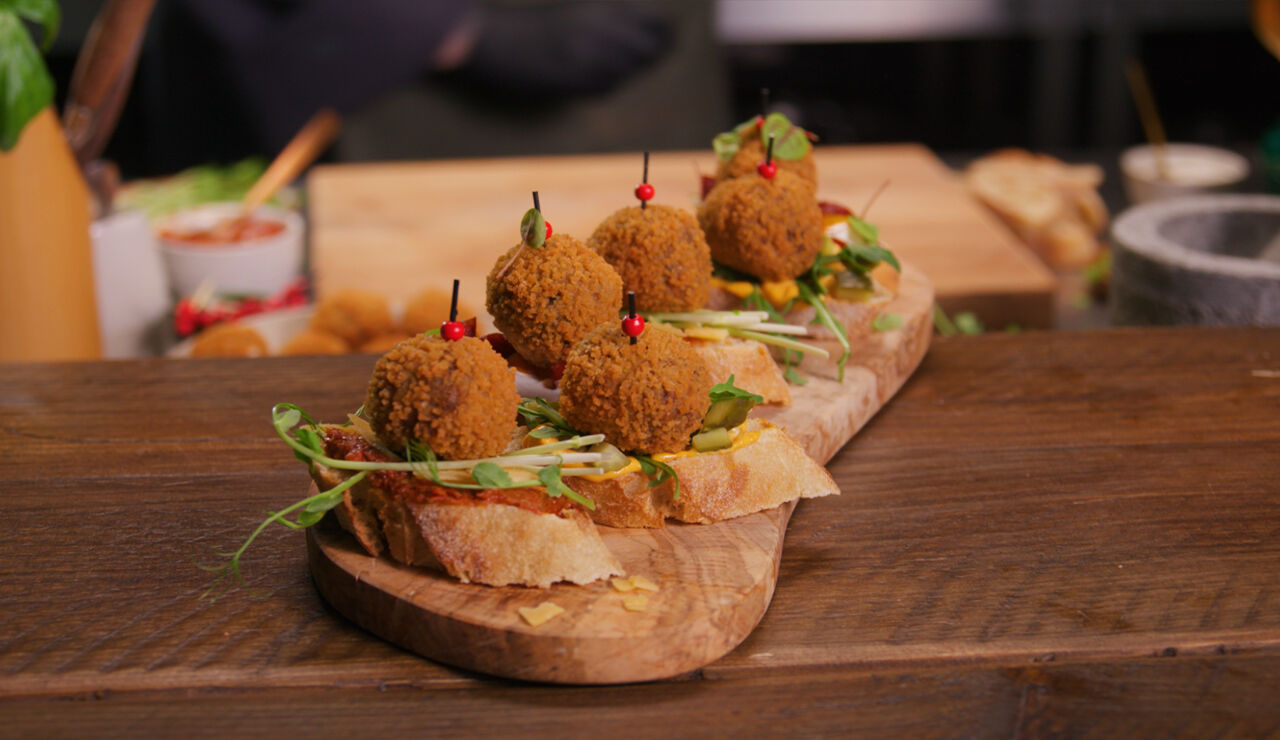 - Vervolgens besmeer je vier plakken brood met de Andalusië saus en verdeel de augurkenblokjes erover. Verdeel de rucola erover, leg er een bitterbal op en zet vast met een prikker.