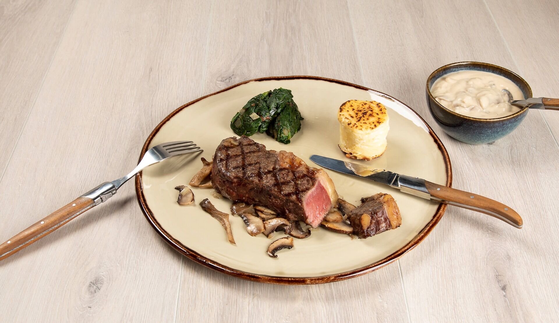 Dry aged entrecôte met gratin met gratin, spinazie en bospaddenstoelenmix