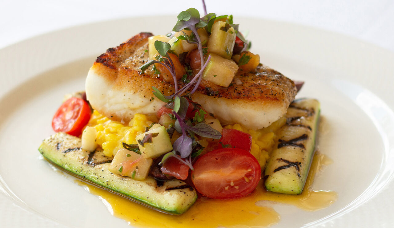 Gebakken meerval met saffraan risotto en gegrilde courgette