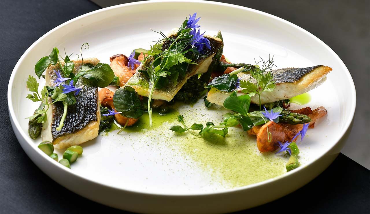 Gebakken zeebaars met cantharellen en een groene kruidenolie