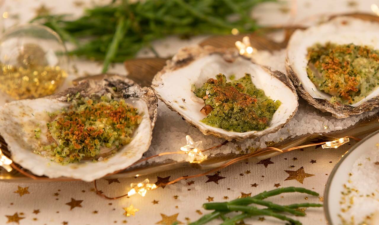 Gegratineerde oester met een kaas-kruidenkorst