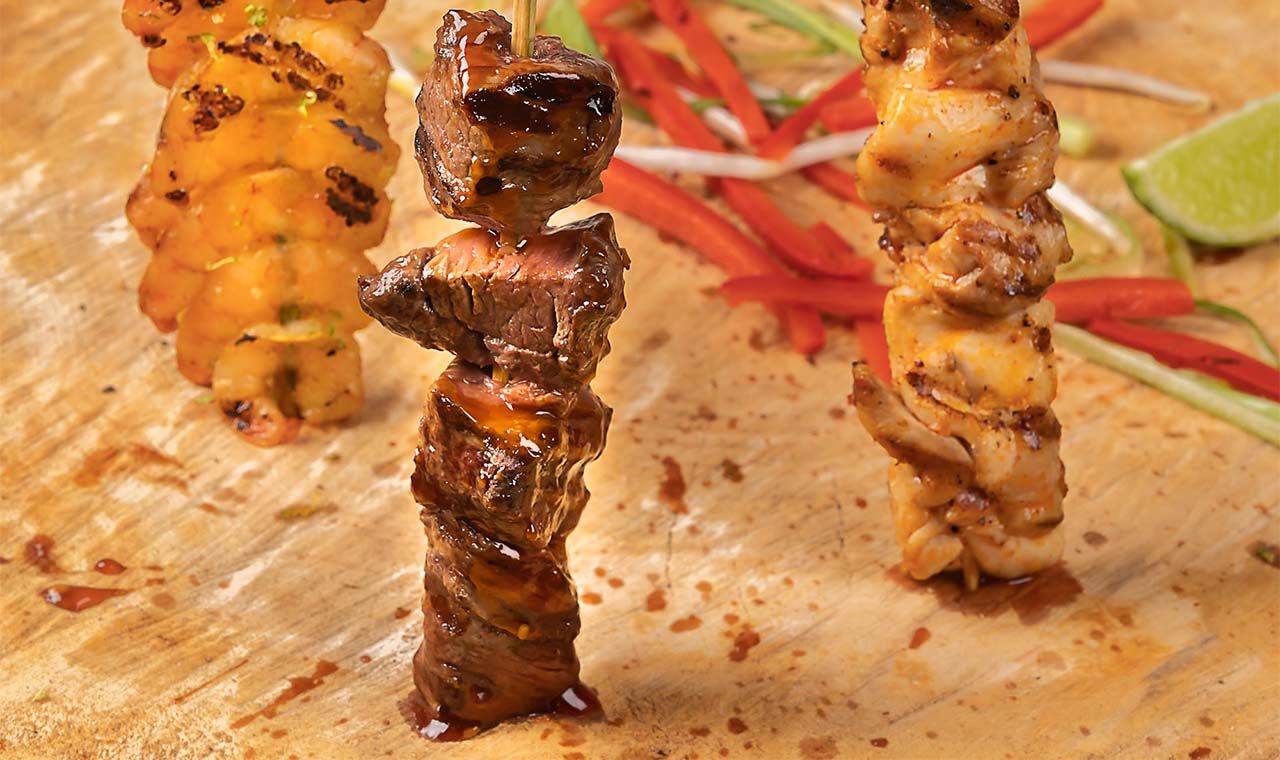 Gegrilde spiesjes van ossenhaas, garnalen en kip