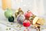 - Prik de saté stokjes in de cakeballen en haal ze twee keer door de chocolademengsels: wit, rood, groen en goud.