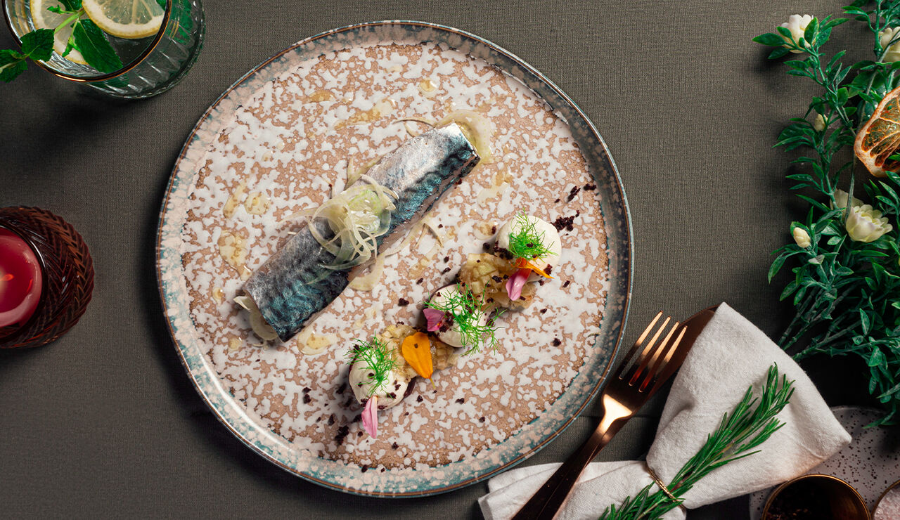 Gemarineerde makreel met citrus vinaigrette en rode biet, granny smith en crème fraîche