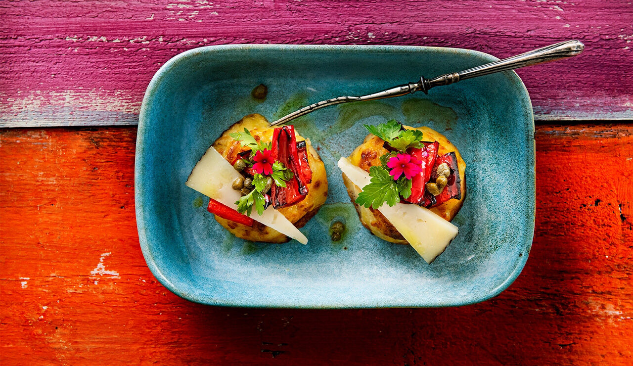 - Leg de gratins op een schaal. Verdeel de geroosterde paprika, puntjes manchego, toefjes peterselie en de kappertjes over de gratins. Besprenkel ze met extra vierge olijfolie.