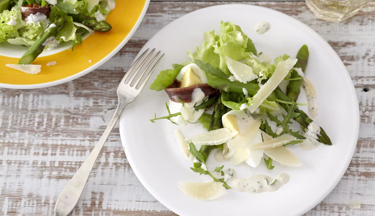 Een gezonde groene salade met Pecorino van Zanetti, groene asperges, ei en ansjovis