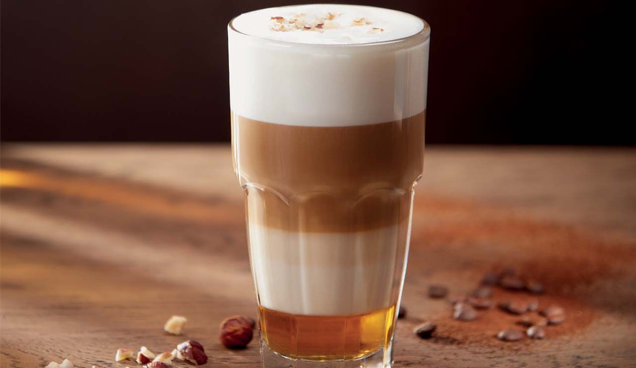 Hazelnut Delight een latte macchiato met hazelnoot siroop en havermelk