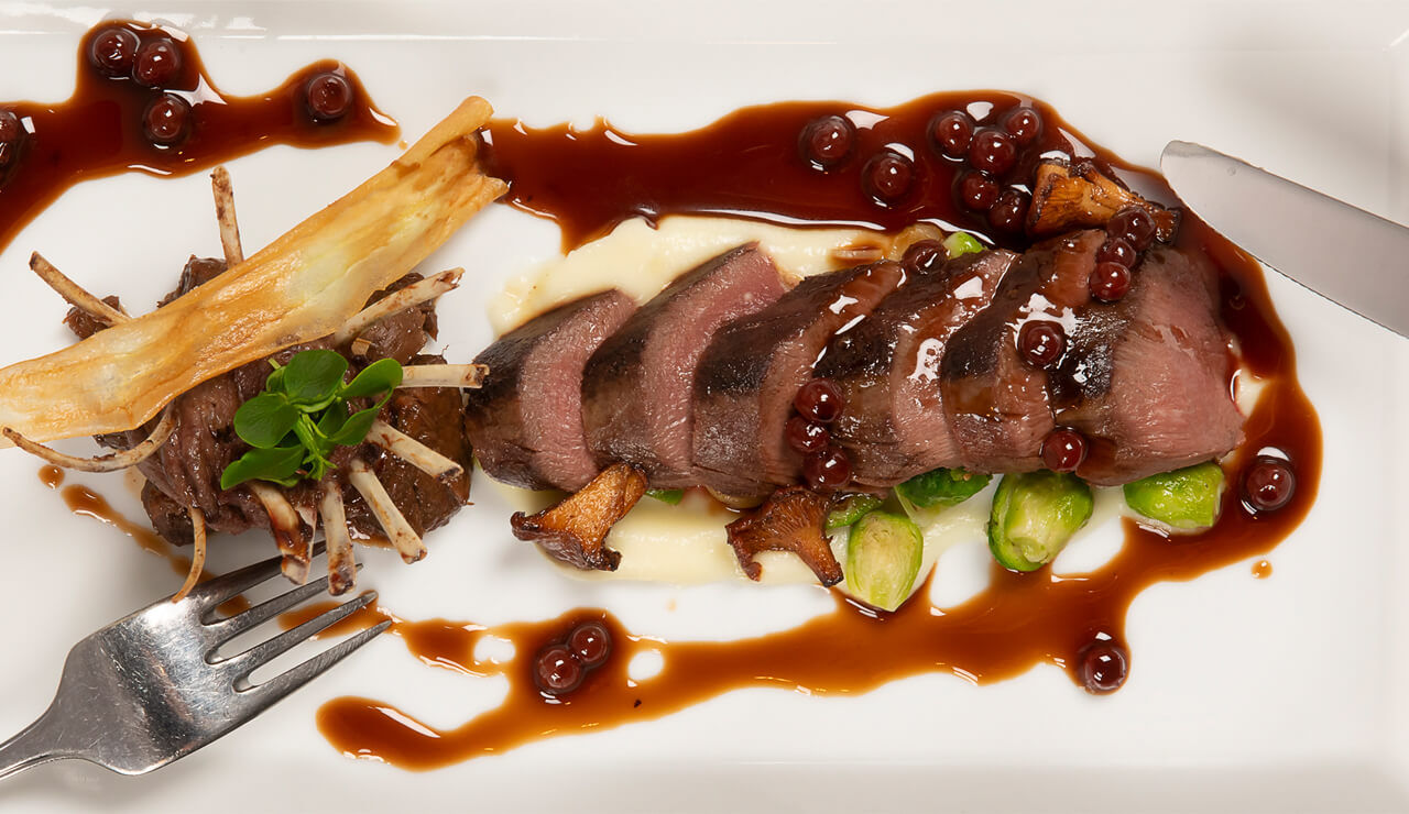 - Wildsaus: kook de wijn tot de helft in, voeg de wildfond toe en kook het nogmaals in. Voeg de kalfsfond toe en kook het nogmaals in. Voeg net voor het meegeven de preiselbeeren toe.