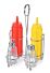 Houder van verchroomd ijzer. Twee glazen strooiers (60 ml) met deksels van roestvast staal 18/0. Twee knijpflessen van polyethyleen.