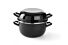 Zwart geemailleerd. Omgekraalde roestvast stalen rand.
