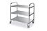 Gemaakt van roestvast staal. Voorzien van 3 bladen met geluiddempend materiaal aan onderzijde blad. Maximale belasting per blad 50 kg. Met 4 zwenkwielen, waarvan 2 geremd, voorzien van hoekbeschermers. Afstand tussen de bladen 270 mm. Werkblad 830x510. Flatpack levering.