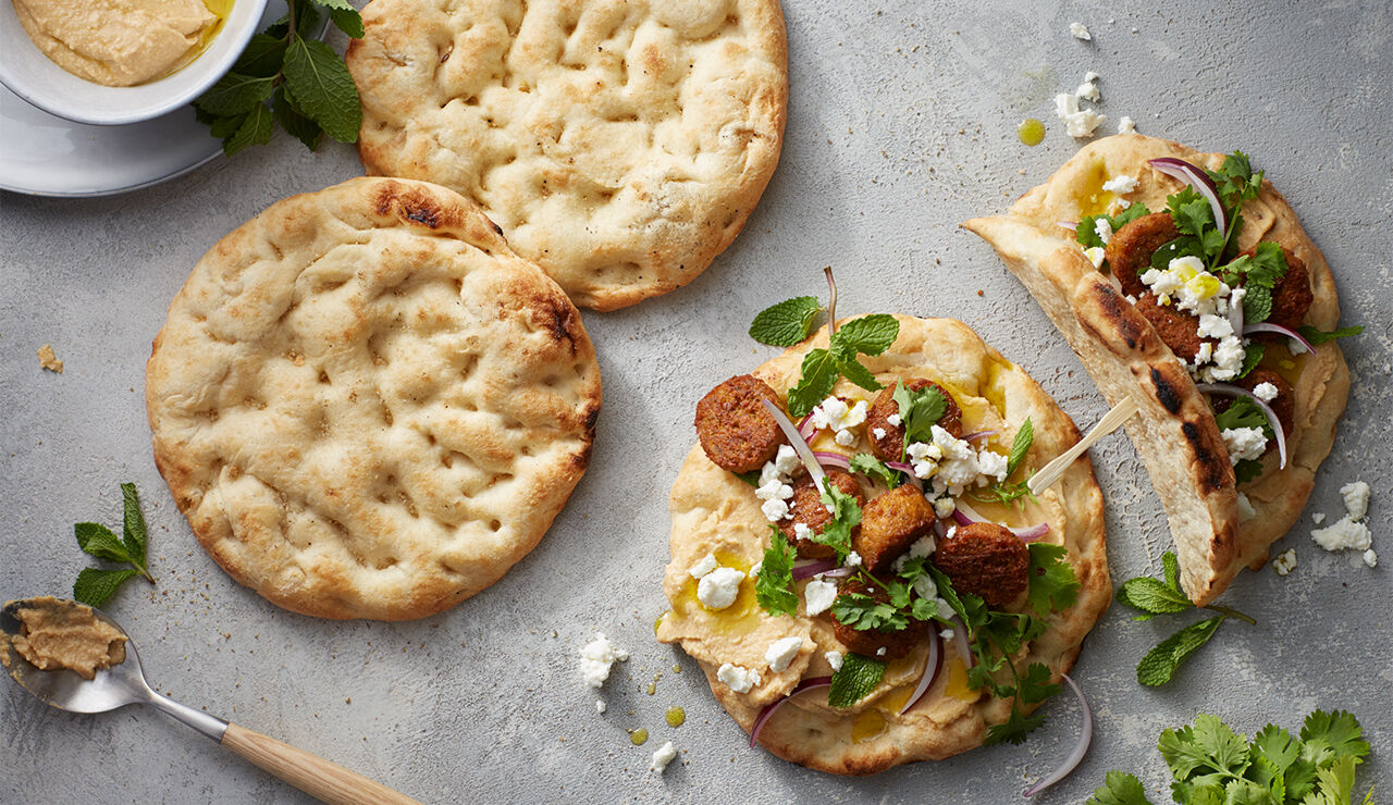 - Leg speels de falafel over het flatbread heen en leg de feta er tussen.
