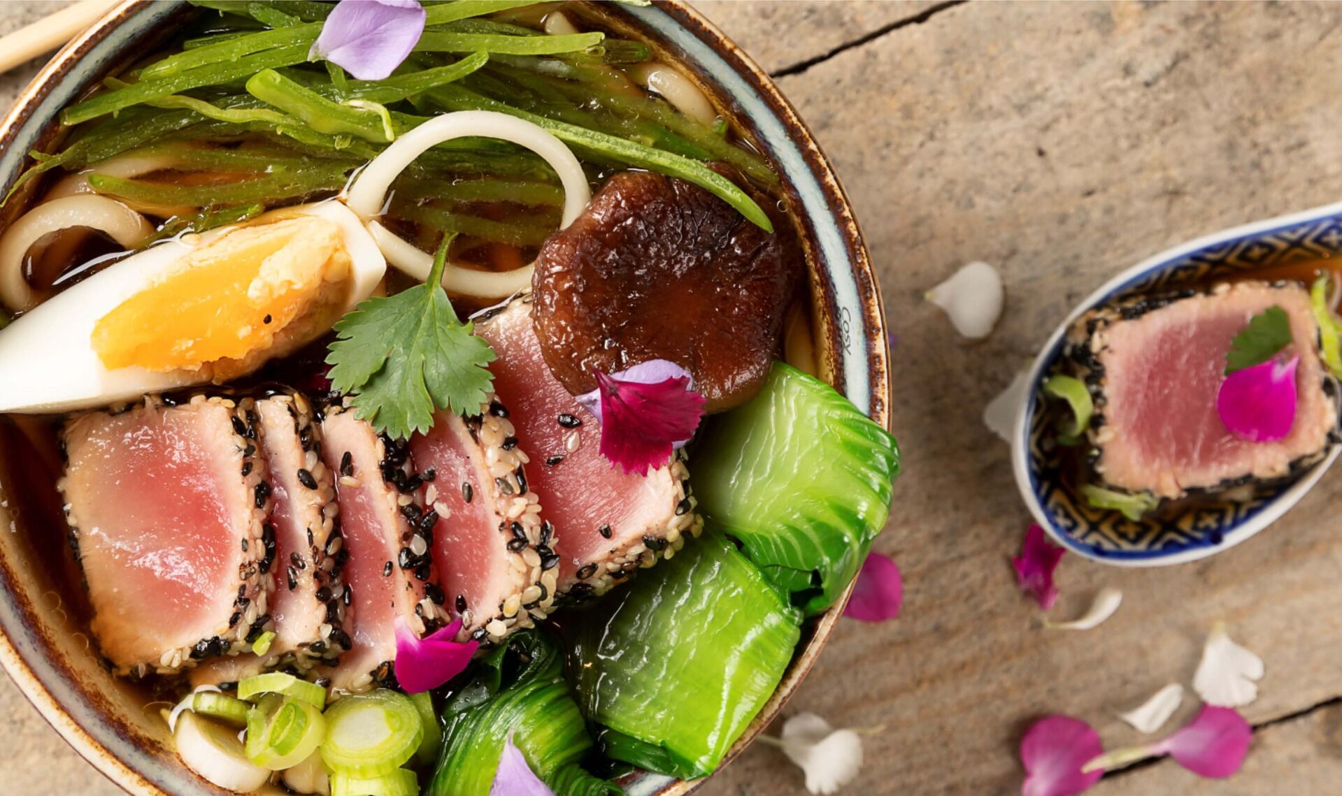 Japanse bouillon met noedels, geroosterde tonijn en groentes