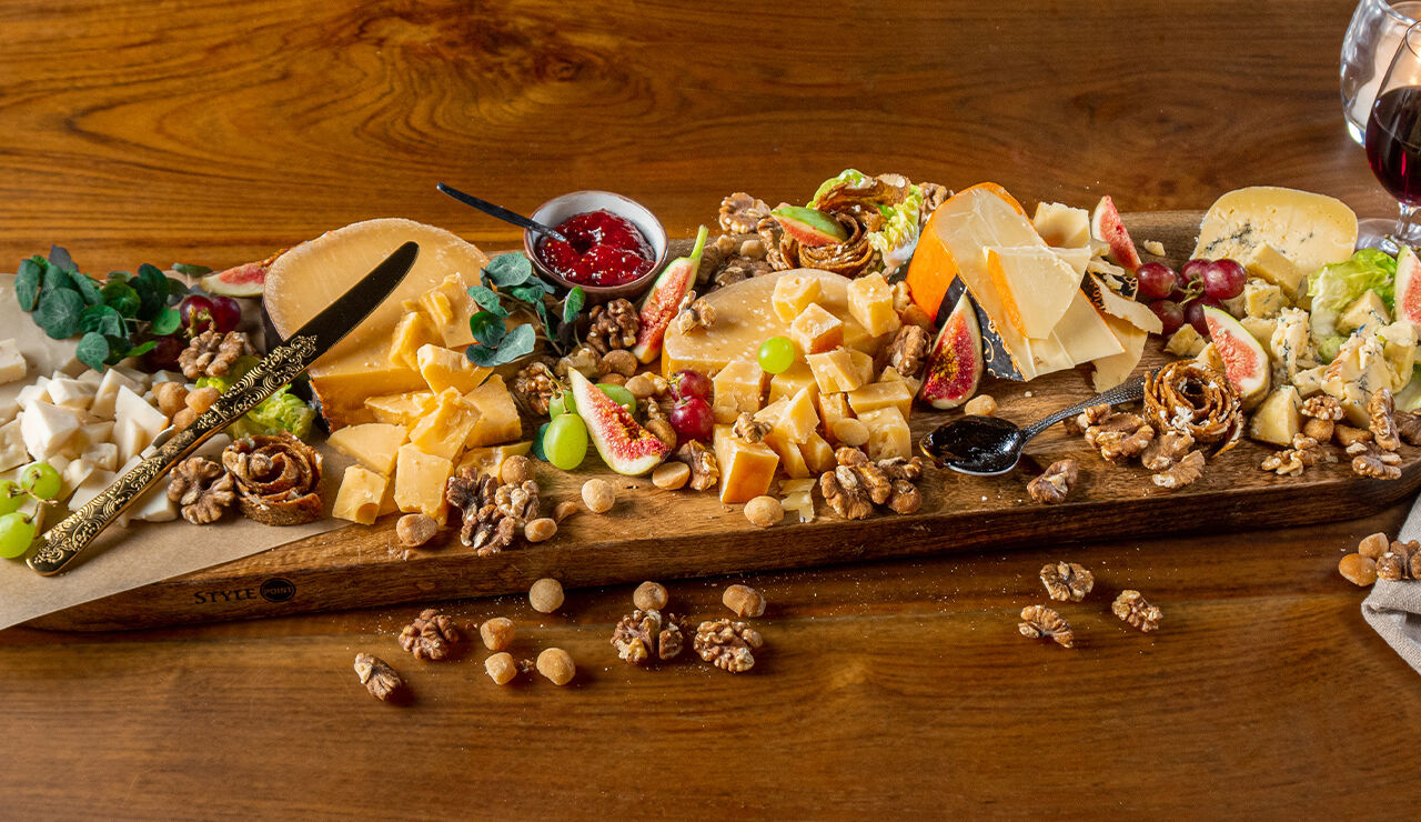 Kaas borrelplank met Hollandse kazen met o.a. belegen geitenkaas, oude kaas en blauwader kaas.