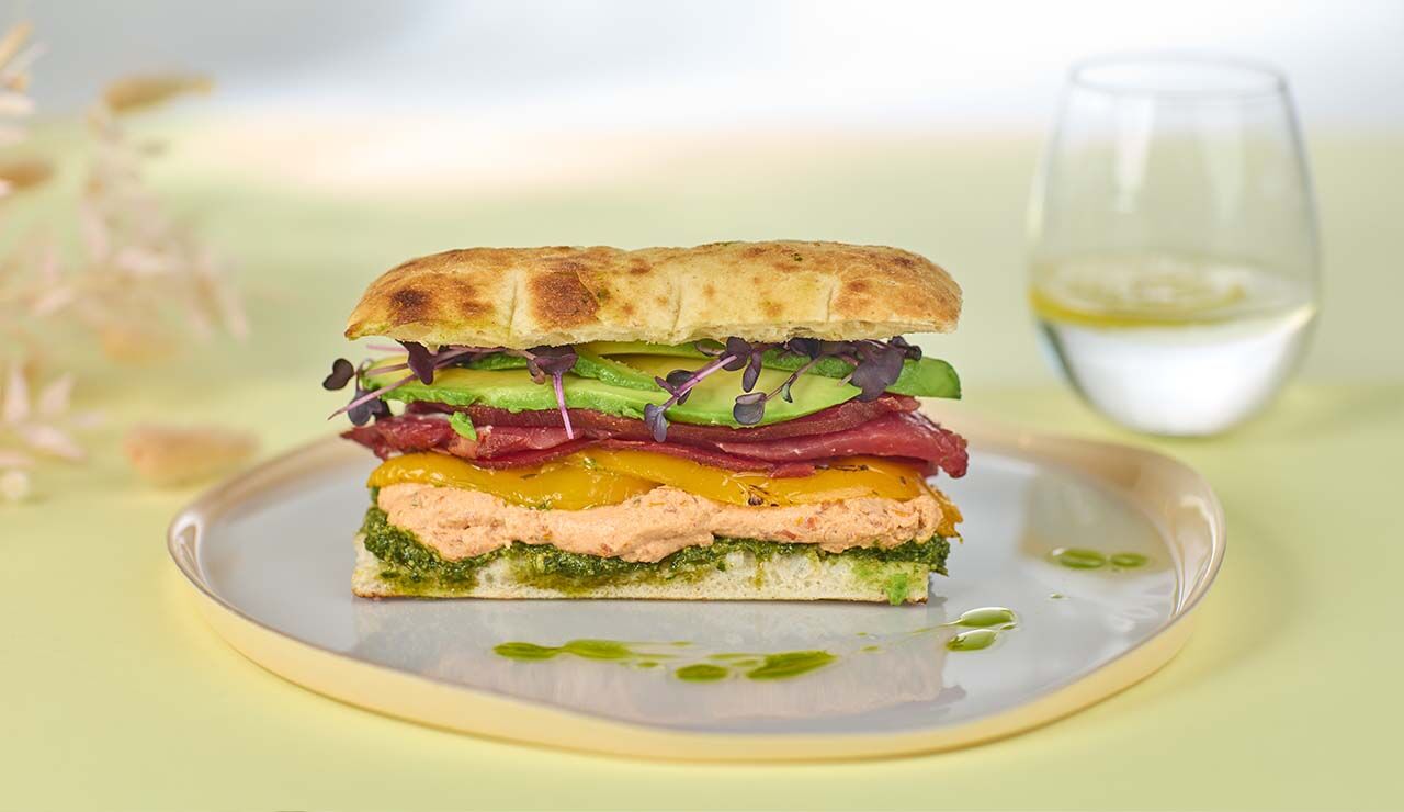 Kleurrijke Schiacciata Sandwich met burrata en avocado