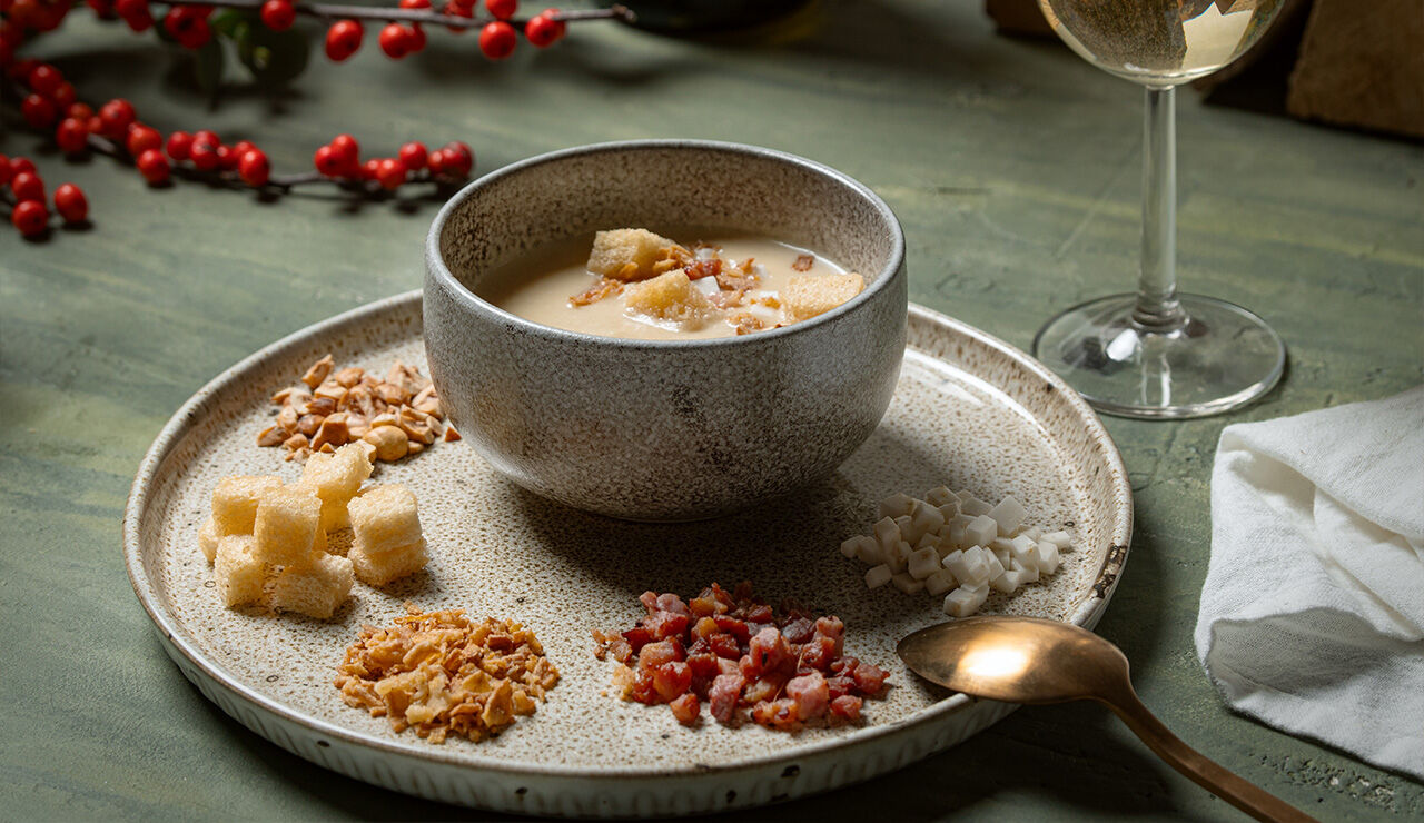 - Voeg royaal de verschillende toppings toe, zoals gebakken uitjes, croutons, spekjes, knolstukjes en gehakte hazelnoten.