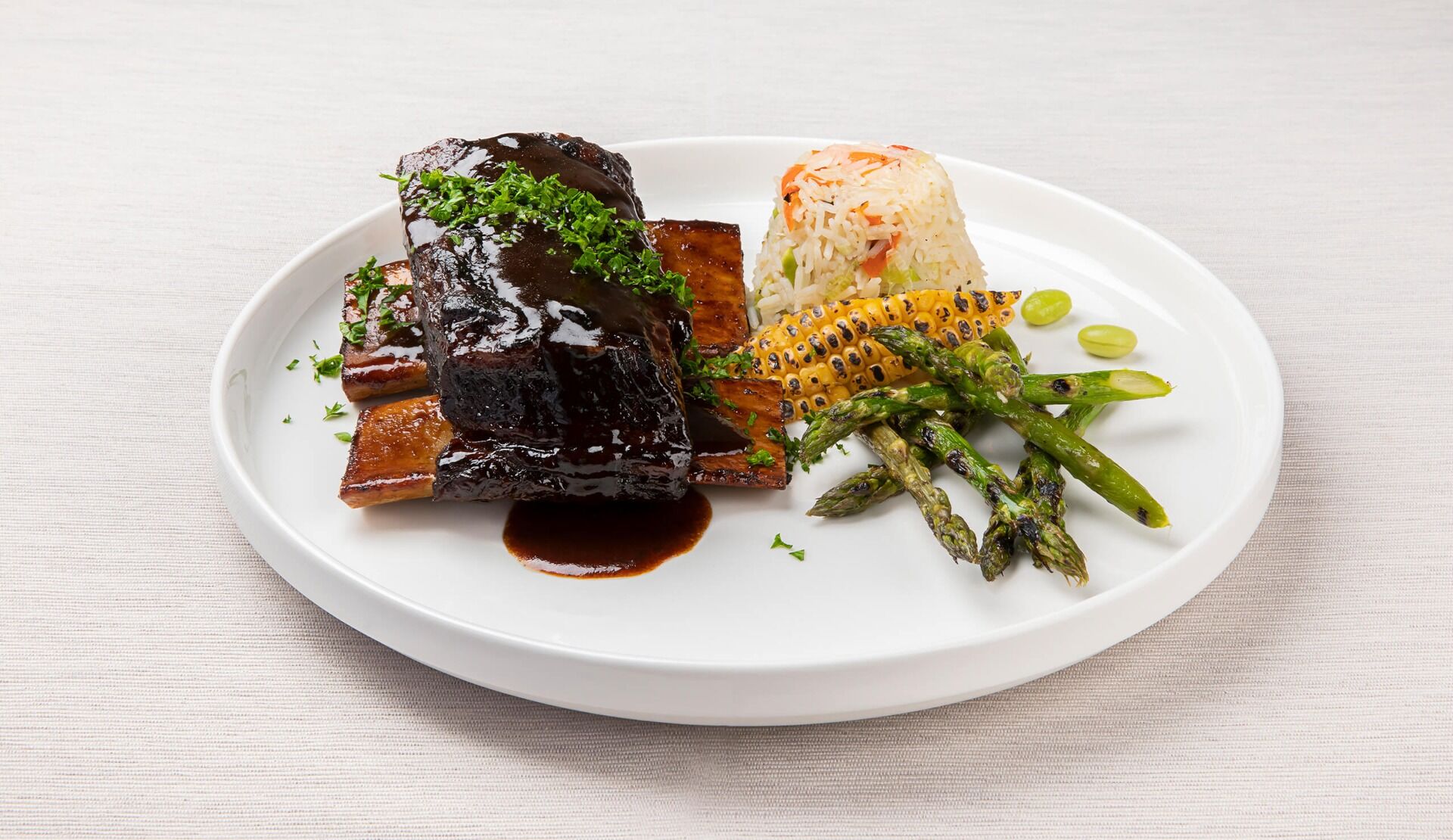 Koreaanse shortribs met galbi barbecuesaus met gevulde rijst, asperges en mais