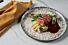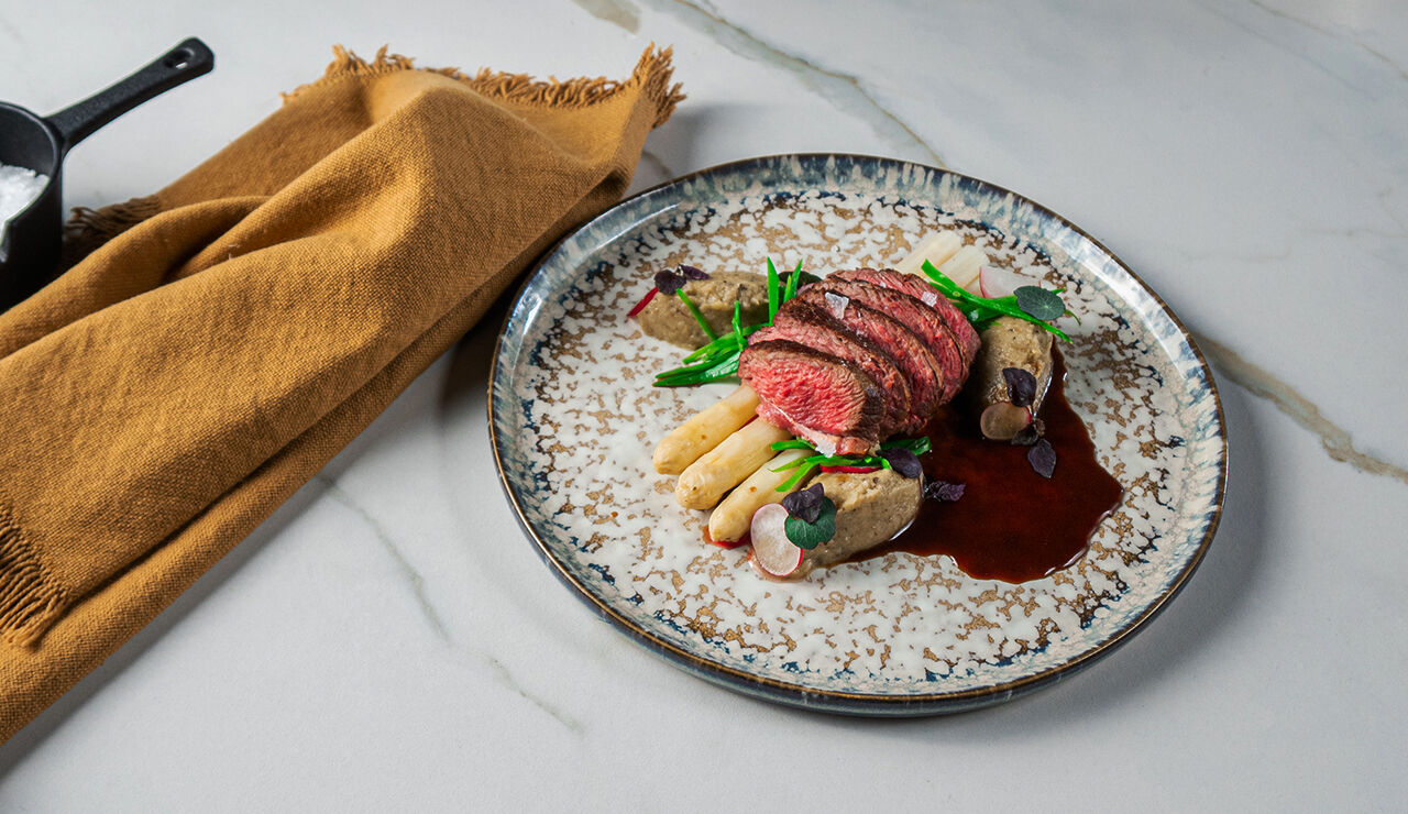 - Leg naast het vlees een quenelle met de aubergine kaviaar en saus het gerecht af.