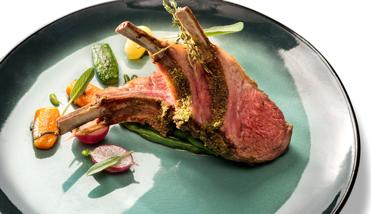 Lamsrack met getourneerde groenten en salie chips en groene kruidenkorst