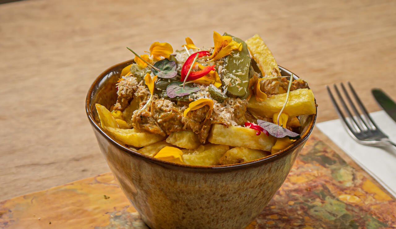 - Versier op het laatste het gerecht af met eetbare bloemen en een beetje gebrande kokosrasp.