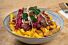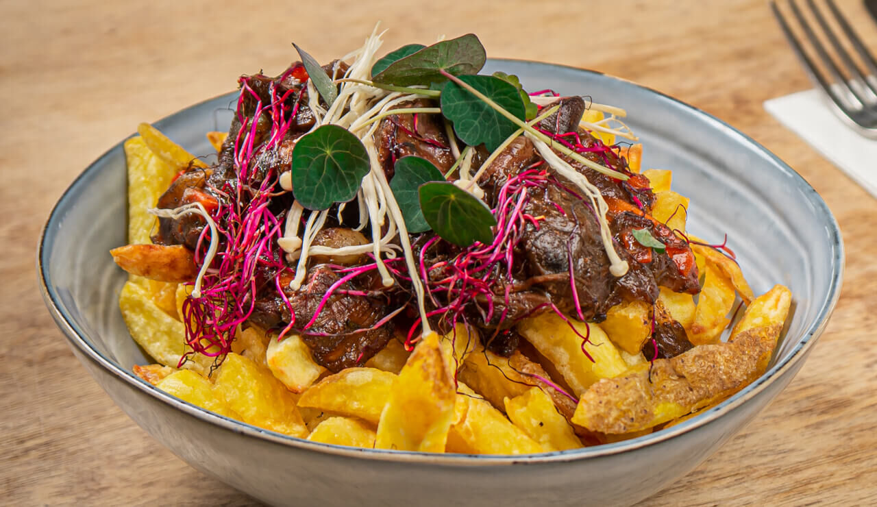 Loaded fries wildstoof met piccalilly, rode biet scheuten en enoki