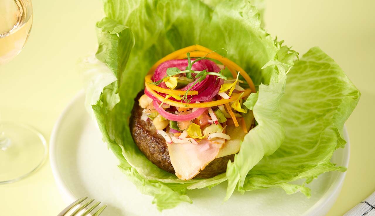 - Leg een burger in het midden van het sla-schaaltje en schep de salade erbovenop.