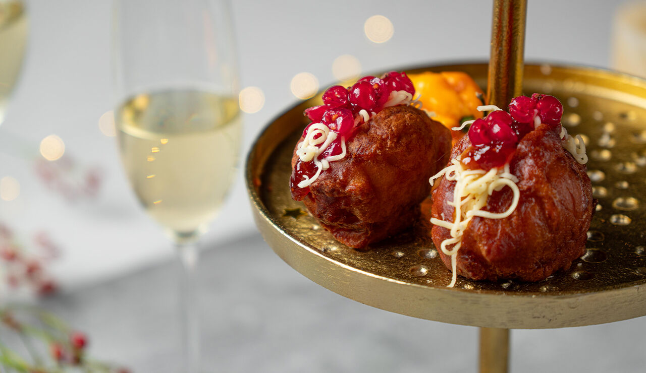 - Snijd de warme oliebollen open en vul ze met geraspte kaas en cranberry compote.