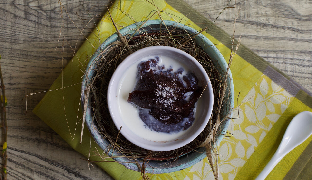 - Doe in een kommetje een laagje melk en schep hier de Mämmi bij.