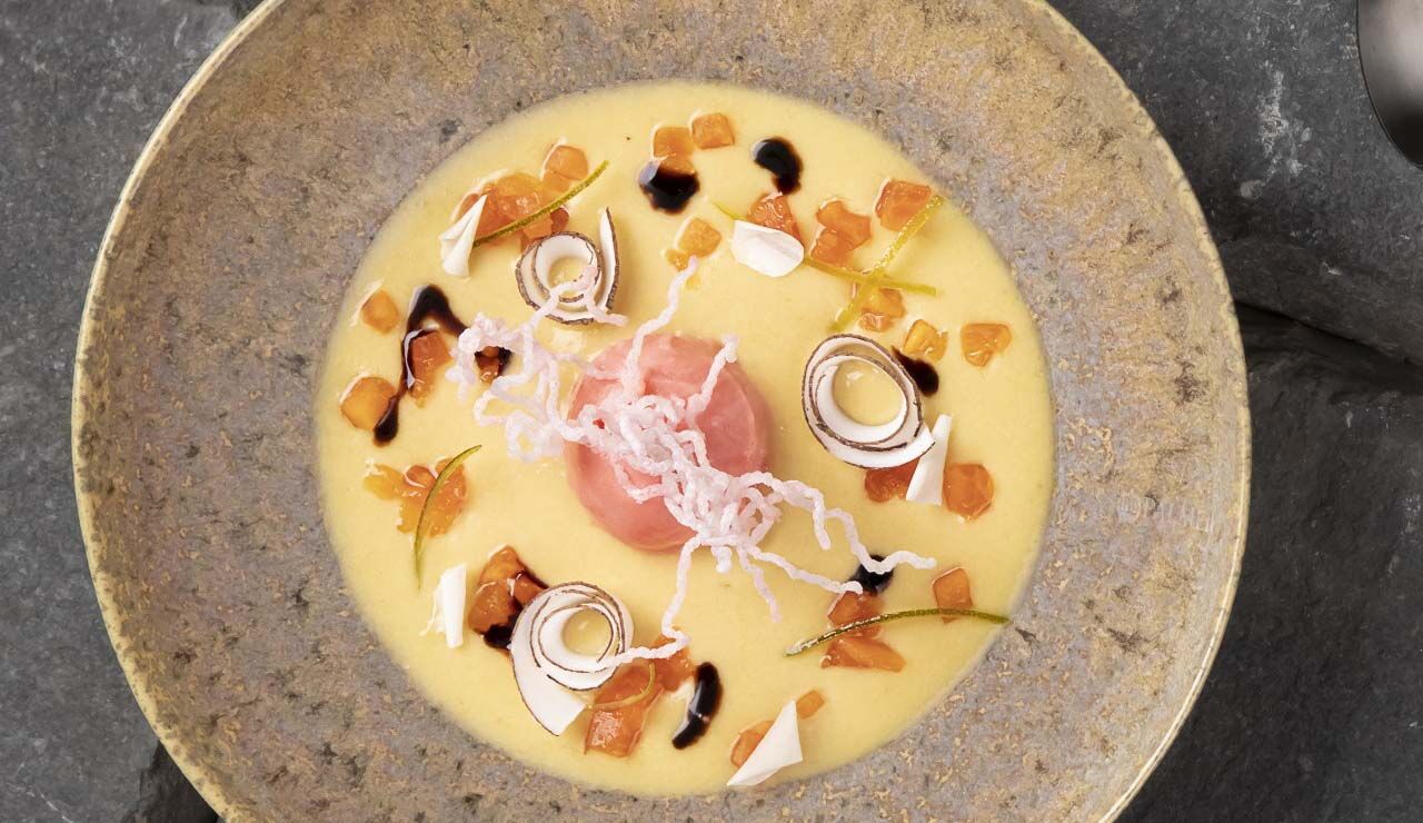 Mango-kokossoep met yuzu, sorbetijs en papaya