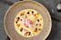 - Strooi de papayabrunoise rondom het ijs, druppel hier en daar wat balsamico en verdeel hier de zestes, kokosroosjes en eetbare bloemblaadjes over.