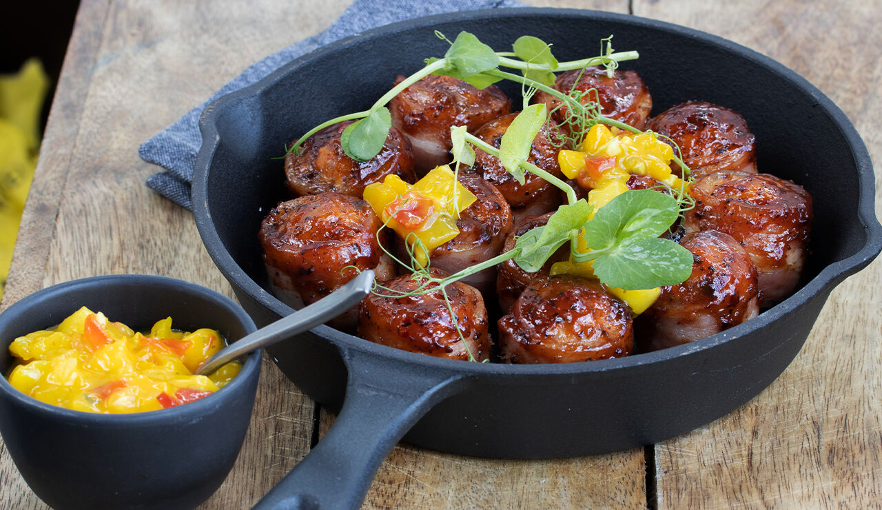 - Vorm 12 gelijkmatige balletjes en laat kort opstijven in de koeling. Wikkel deze in met ontbijtspek en prik vast met een satéprikker.