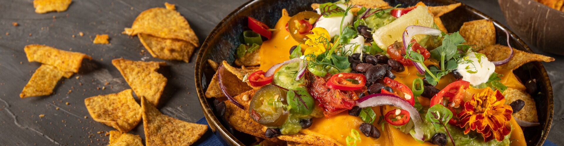 Nacho's met jalapeños cheddar, zwarte bonen, crème fraîche en guacamole