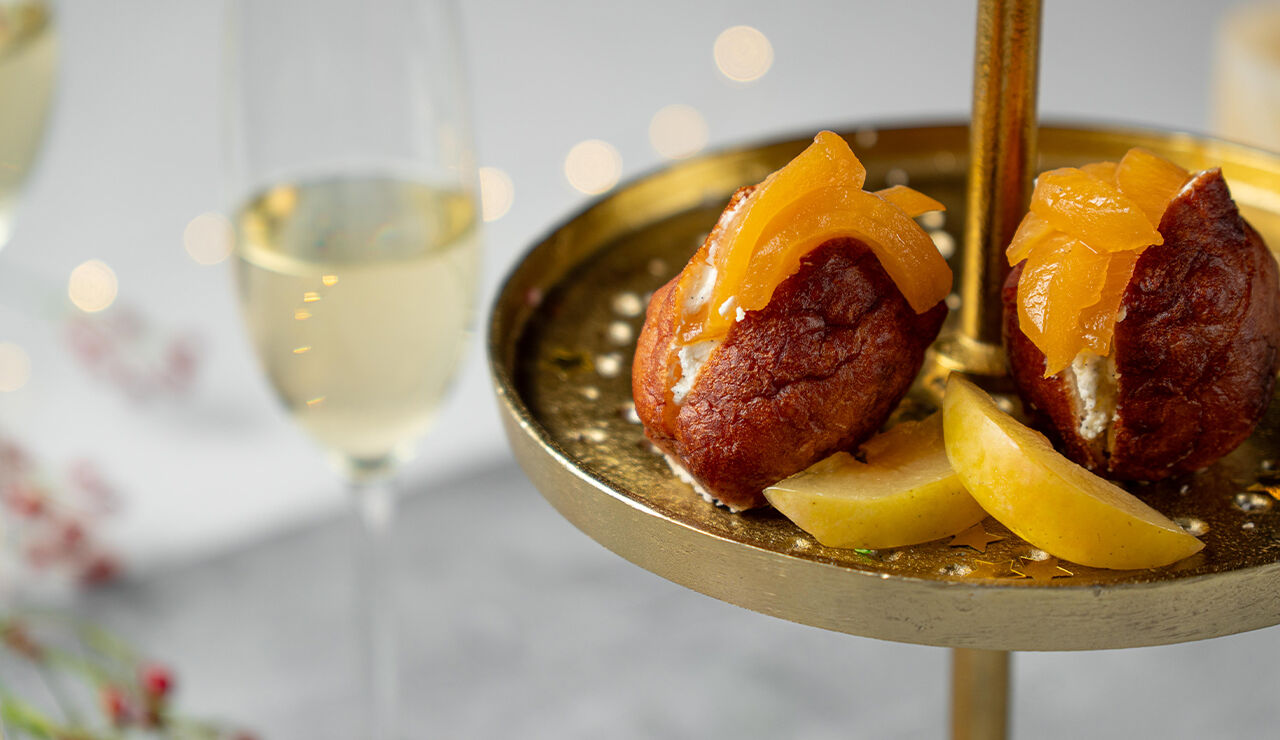 Serveer de oliebollen met pruimen en tonkaboon crème direct voor een verrukkelijk en origineel dessert!